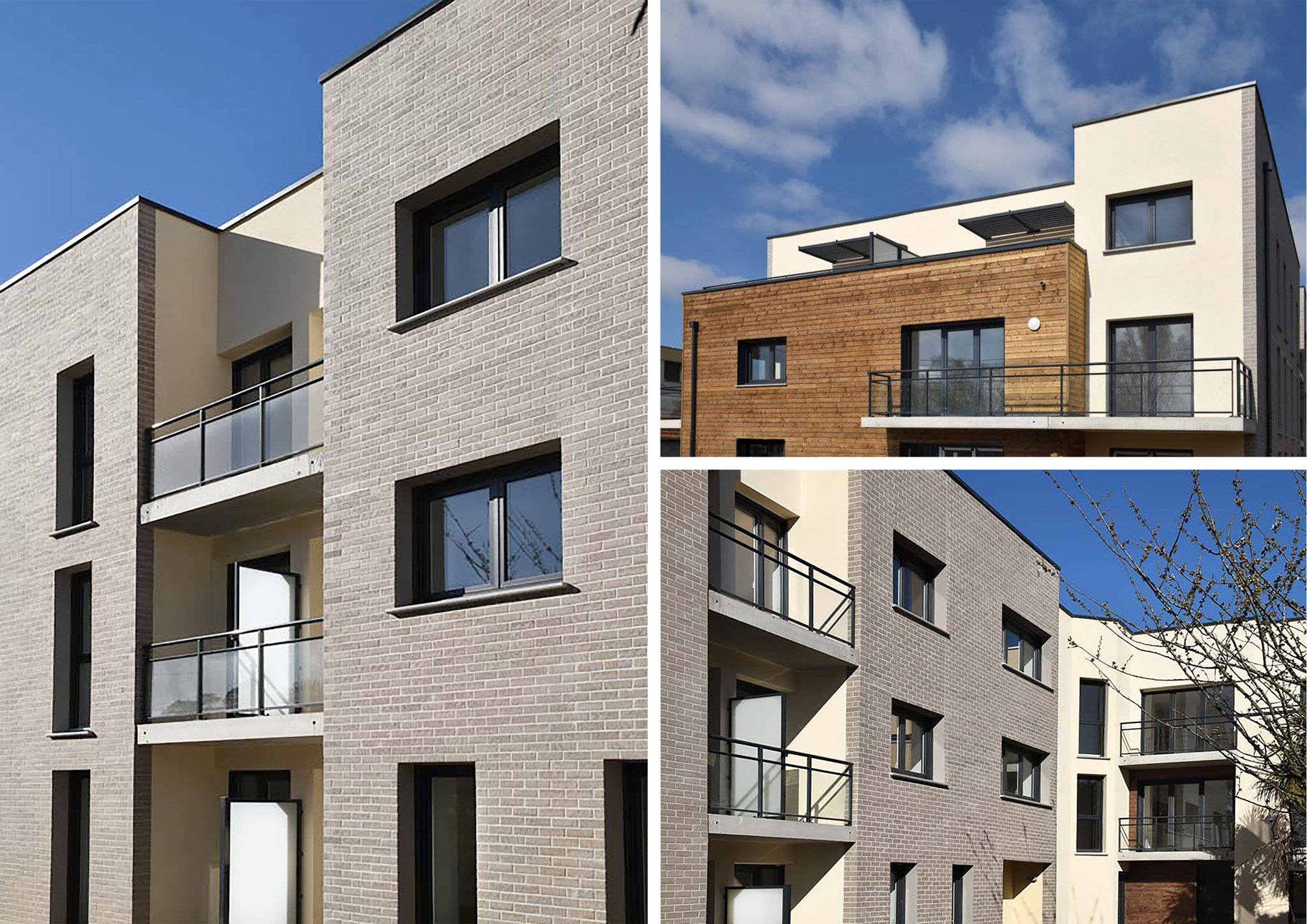 La volumétrie générale se veut contemporaine. Des jeux d’avancées et de reculs de façades enrichissent la volumétrie, au même titre que l’utilisation d’un parement de brique brunes allongées et de bardage bois ton naturel.