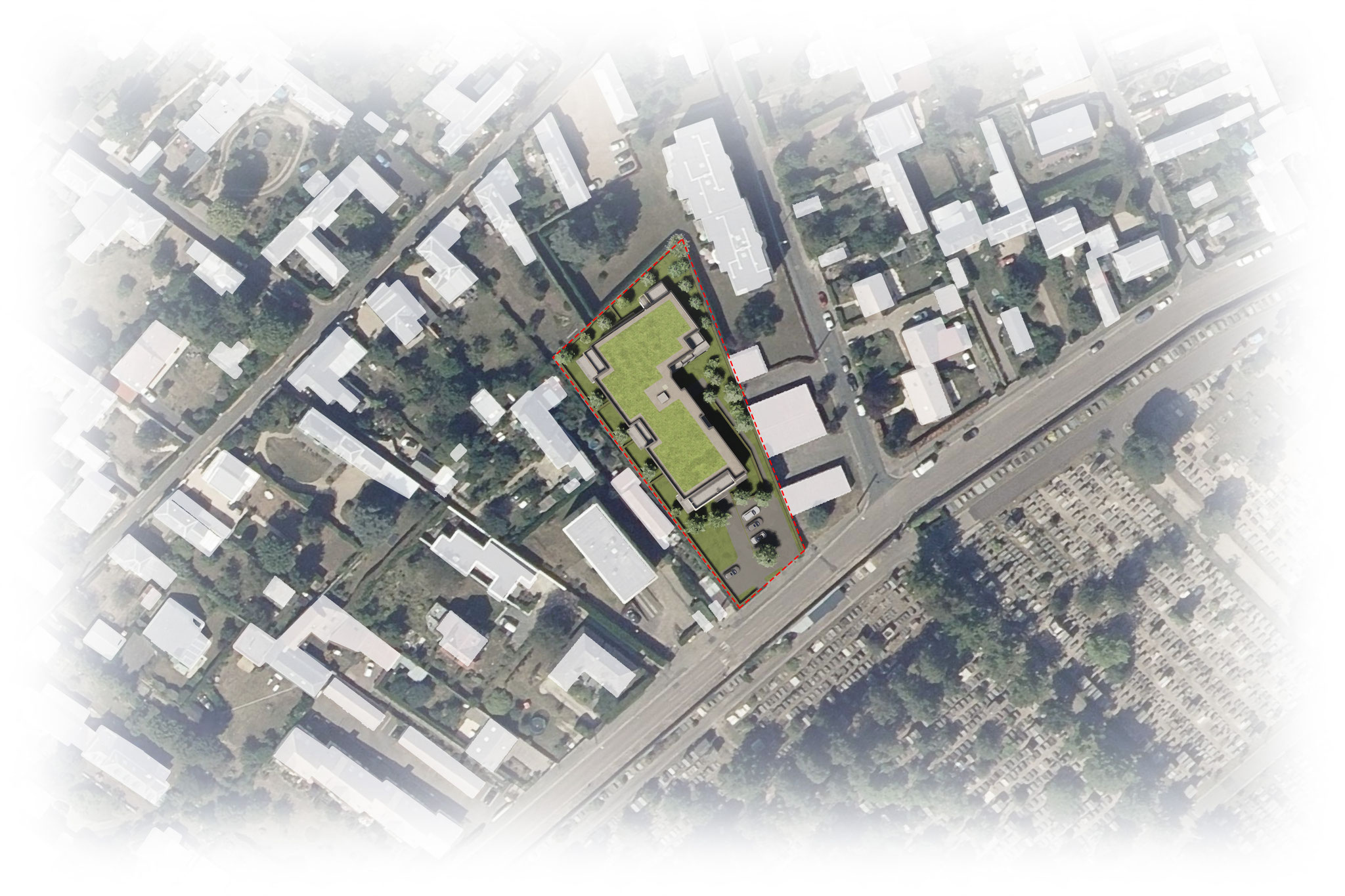 Situé à Bihorel rue des Canadiens, le terrain est encadré par le grand cimetière du Monumental au Sud-Est et un quartier plutôt ancien, à vocation principale d’habitat, au Nord-Ouest.